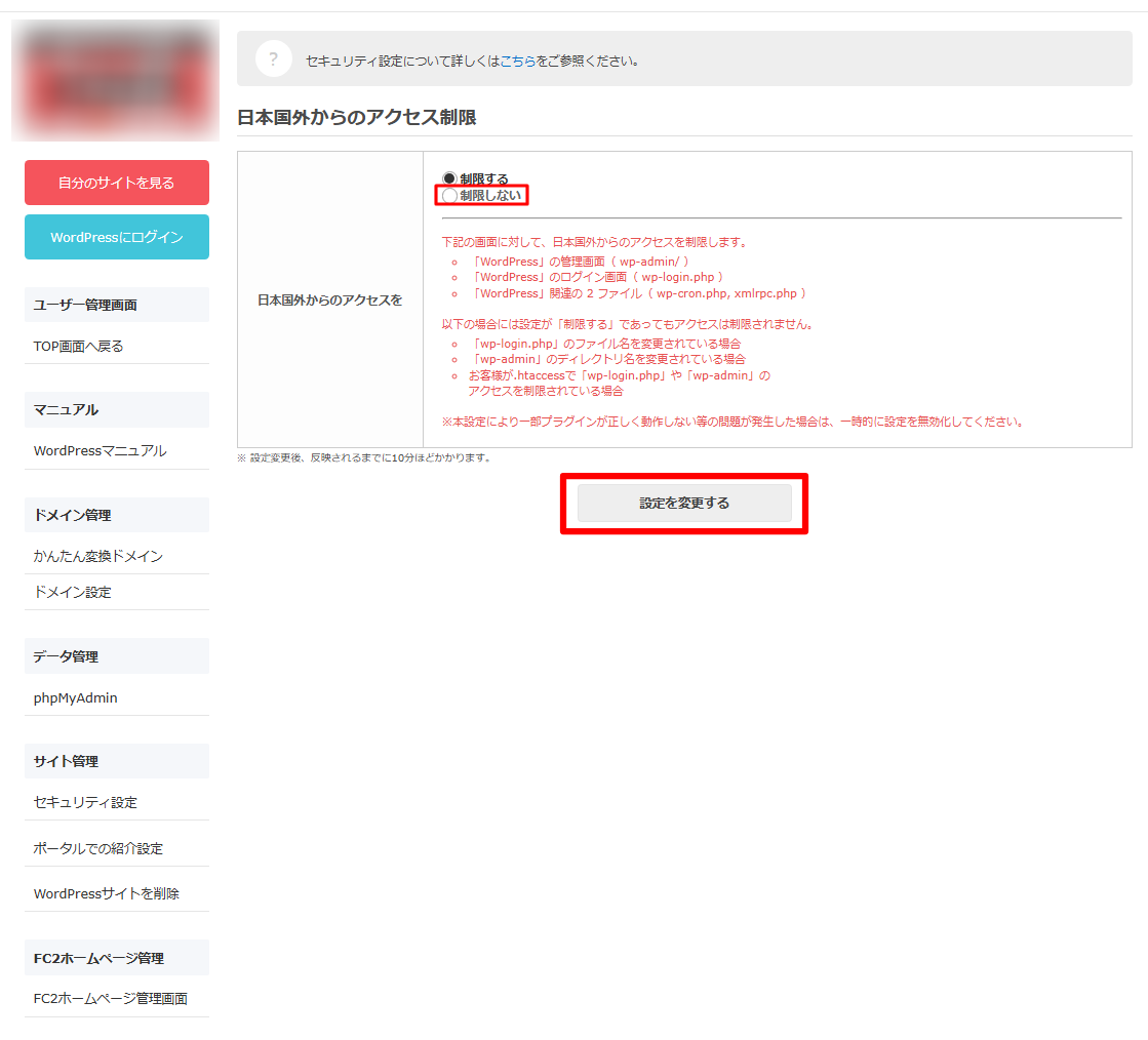 1. FC2ホームページWordpress管理ページの「セキュリティ設定」をクリック。